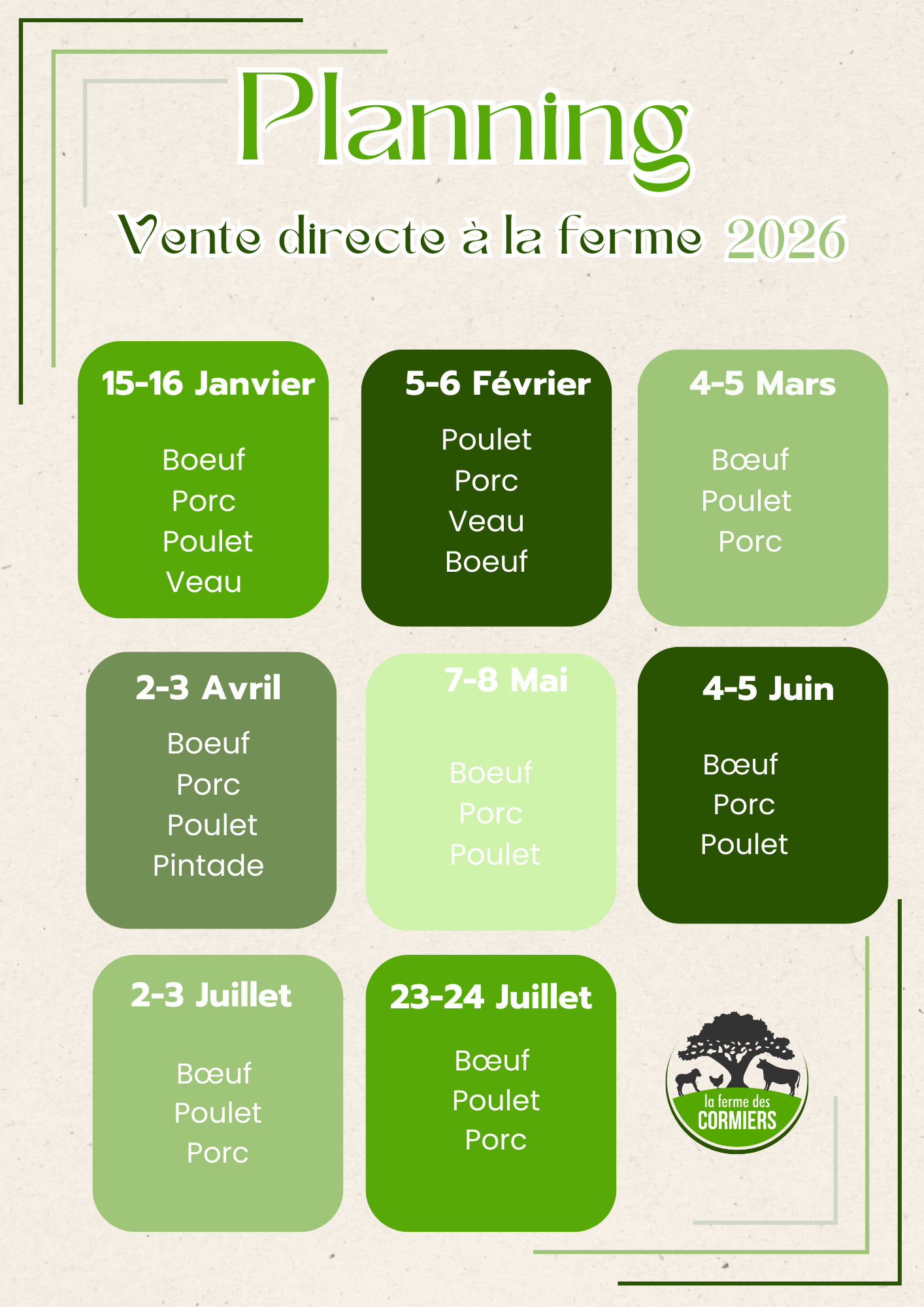 Maxime, agriculteur à St Père en retz, accompagné de Kylian et Annabelle, l'équipe de la Ferme des Cormiers vous propose des colis de bœuf, de race limousine, label rouge, des colis de veau « sous la mère », du poulet fermier élevé en plein air, et du cochon sur paille!